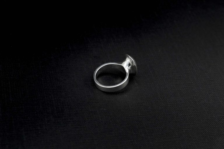 Forma pierścionka jest oszczędna, ale zdecydowana. Obrączka płynnie unosi się w kierunku oprawy, budując napięcie między ciężarem metalu a lekkością światła.